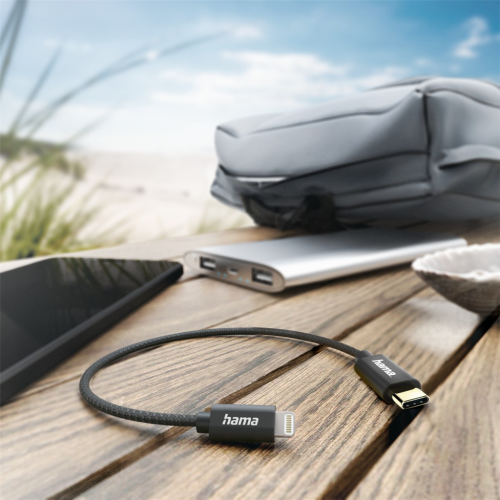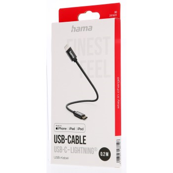 Hama MFi USB-C Lightning kábel pre Apple, 0,2 m, opletený, čierny