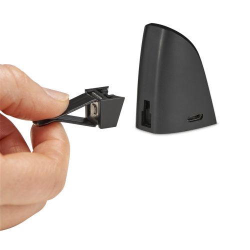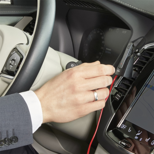 nabíjací stojan je možné položiť na stôl v kancelárii, alebo ho pomocou svorky pripevniť na lamely ventilačnej mriežky vo vozidle
