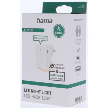 Hama nočné/orientačné LED svetlo, do zásuvky, 1x USB-A, 1x USB-C, súmrakový senzor
