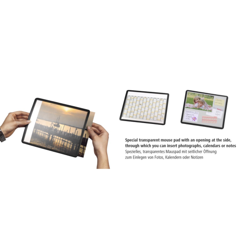 - podložka pod myš pre ľahký a presný pohyb myši - priestor pre individualitu: bočný otvor na vloženie fotografií, kalendára alebo poznámkových listov - transparentný povrch s čiernym okrajom - vhodná pre …
