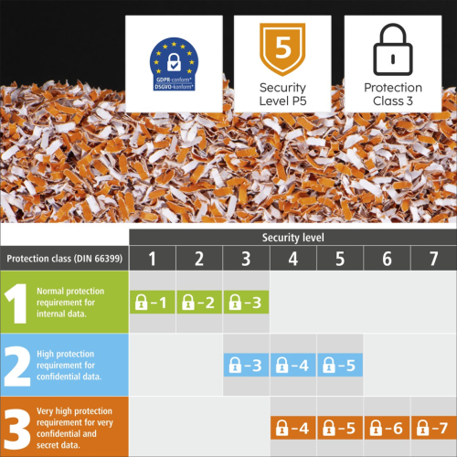• úroveň ochrany 3: profesionálna skartovačka zaručuje veľmi vysokú úroveň ochrany pre mimoriadne dôverné a tajné údaje na papieri (P5), nosiče magnetických dát ako preukazy (T5) a elektronických dát ako čipové karty (E4)