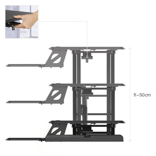 - výškovo nastaviteľný stolný podstavec pre monitor umožňujúci pri práci sedieť aj štát - prídavná znížená polica pre klávesnicu a myš - ľahké a plynulé nastavenie výšky vďaka plynovému piestu v rozsahu …