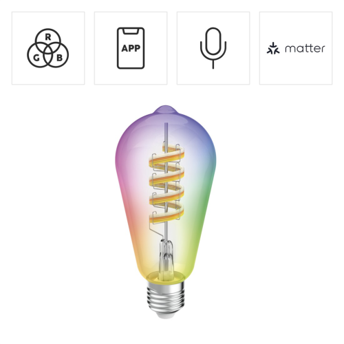 • it doesn't Matter: podpora nového štandardu Matter umožňuje žiarovku začleniť do vašej chytrej domácnosti pomocou akejkoľvek aplikácie kompatibilnej s Matter (napr. Alexa, Apple Home, Google Home) a následne ju ovládať odkiaľkoľvek pomocou mobilného telefónu alebo tabletu