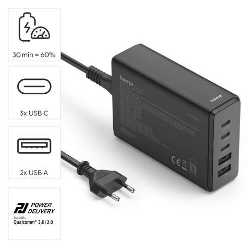 Hama USB nabíjacia stanica GaN, 3x USB-C PD, 2x USB-A (1x QC), 140 W