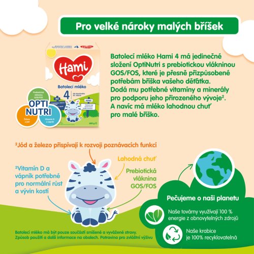 Dôležité upozornenie: Hami 3 na dobrú noc je určené pre výživu detí od 1 roka ako súčasť zmiešanej a vyváženej stravy dieťaťa, nie je náhradou materského mlieka. Dojčenie je pre dieťa to najlepšie. Vyvarujte sa dlhému kontaktu mliečnej výživy so zúbkami - zvyšuje riziko výskytu zubného kazu. Starajte sa pravidelne o zúbky dieťaťa, najmä pred spaním. Požiadajte o radu zubného lekára. Pre zdravie dieťaťa je dôležité dodržiavať návod na prípravu a uvedené odporúčania. Hami 3 na dobrú noc nie je určené na výživu dojčiat do 1 roku veku. Podporujeme odporúčania WHO – plné dojčenie v prvých 6 mesiacoch veku a pokračovanie až do 2 rokov veku a ďalej, spolu so zavádzaním bezpečnej a vhodnej doplnkovej stravy.