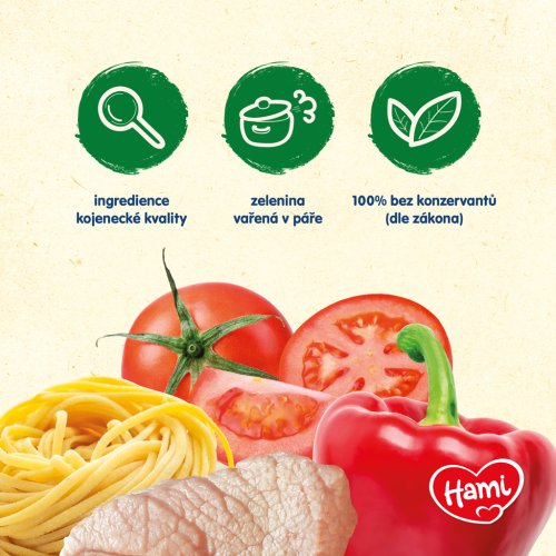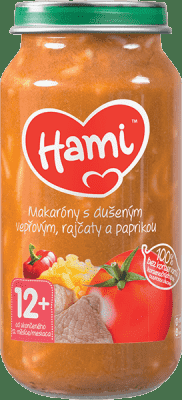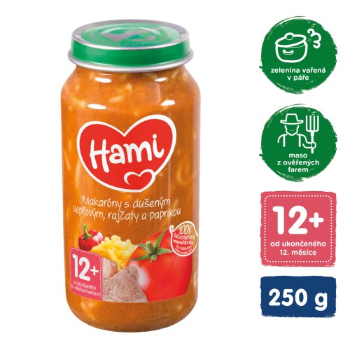 Hami Makaróny s duseným bravčovým, paradajkami a paprikou (250 g) je mäsovo-zeleninový príkrm vhodný od ukončeného 12. mesiaca.