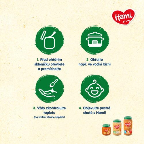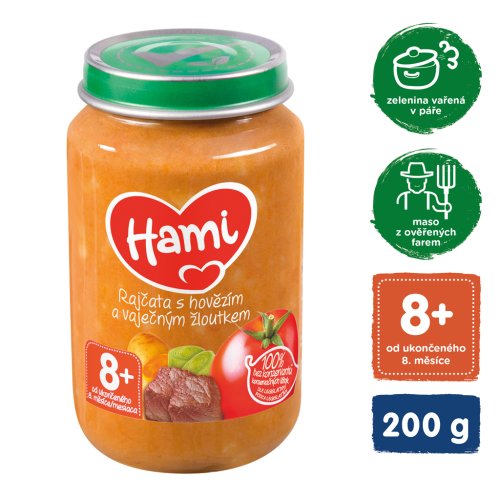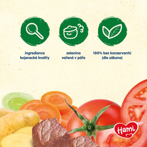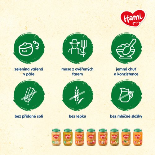 Vyvážený obsah zeleninovej a mäsovej zložky v každej receptúre je vhodná kombinácia pre správny jedálniček Vášho dieťaťa. Každý druh zeleniny či mäsa prináša totiž iné potrebné živiny na správny rast a vývoj dieťaťa. Hami vo svojich príkrmoch ponúka 21 druhov zeleniny a 9 druhov mäsa. Zostavenie pestrého týždenného jedálnička je tak veľmi jednoduché.