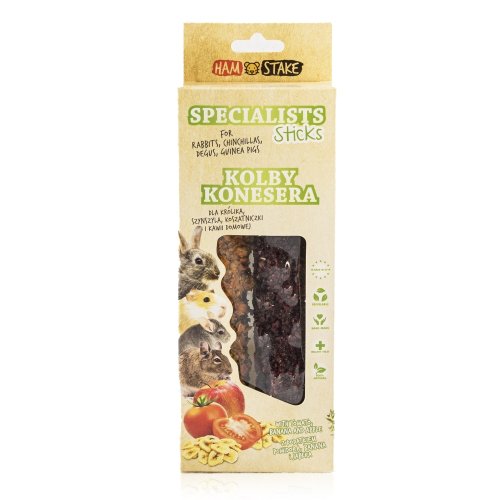 Neodolateľne voňavý klas Ham-Stake tvorený bohatou zmesou sušených byliniek, sušenej zeleniny a ovocia je opatrený konopným pútkom na zavesenie. Ide o skvelú interaktívnu hračku a súčasne aj veľmi chutnú a zdravú maškrtu pre všetkých drobných hlodavých bylinožravcov. Vašim malým kamarátom zaistí jedinečný chuťový a čuchový zážitok aj zmysluplnú zábavu a poslúži im aj na obrusovanie zubov. Obsahuje množstvo vitamínov, minerálov a ďalších zdraviu prospešných látok. Vysoké množstvo vlákniny prospieva správnemu tráveniu. Maškrta navyše šetrí životné prostredie – je možné skonzumovať úplne celú vrátane pútka, takže nevzniká žiadny odpad. Balenie obsahuje 2 klasy. Hlavné prednosti: