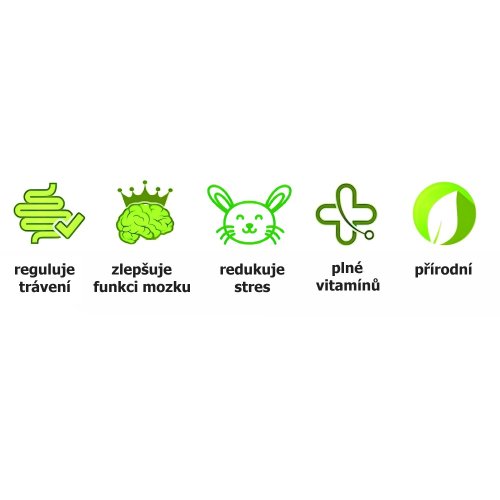Vhodné pre: králiky, morčatá, osmáky a činčily. Zloženie: mrkva, červená repa, paradajka, banán, paštrnák, jablko, púpava, skorocel, žihľava, petržlen, echinacea, ďatelina, lucerna, mäta, list brezy, medovka, lipový list, nechtík, škrob. Analytické zložky: hrubý proteín 7,4%, hrubý tuk 2,3%, hrubá vláknina 6,2%, hrubý popol 6,5%, vlhkosť 11%. Kŕmny návod: Podávajte ako maškrtu pre doplnenie každodennej stravy. Maznáčikovi zaistite stály prístup k čerstvej pitnej vode.