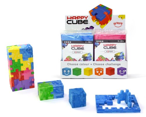 Prudko zábavné a návykové - tak by šlo charakterizovať penové 3D puzzle s názvom Happy Cube® (Veselá kocka). Precvičte si mozog a pustite sa do úžasného sveta Happy Cube s rôznymi stupňami obtiažnosti. Organizujte turnaje s priateľmi alebo s rodinou a skvele sa bavte! Skladanie 3D puzzle kocky Happy Cube Vám prevetrá mozgové závity, zlepšuje koncentráciu, rozvíja priestorové myslenie, koordináciu a znižuje stres. Základnou úlohou je zostaviť dokonalú kocku zo šiestich rovnako farebných dielov. Nie je to však také jednoduché, ako by sa na prvý pohľad mohlo zdať. Obvykle existuje iba jediný spôsob, ako kocku zložiť. Ďalšou úlohou je naskladať jednotlivé dieliky Happy Cube späť do dvojrozmerného rámu, v ktorom boli dodané. Treťou úlohou a skutočnou výzvou je potom zložiť väčšiu a zložitejšiu trojrozmernú zostavu pridaním ďalších druhov kociek rovnakej skupiny. Niektoré štruktúry sú ťažšie ako ostatné a ich príklady nájdete na obale každého výrobku Happy Cube. K dispozícii sú štyri skupiny 3D puzzle kociek Happy Cube, z ktorých každá obsahuje 6 rôznych kociek. Každá skupina má unikátnu farebnú štruktúru, štýl a úroveň obtiažnosti. V rámci každej skupiny sú kocky a teda aj obtiažnosť rozlíšené podľa farieb. K dispozícii je teda celkom 24 rôznych kociek. Štyri skupiny kociek Happy Cube: