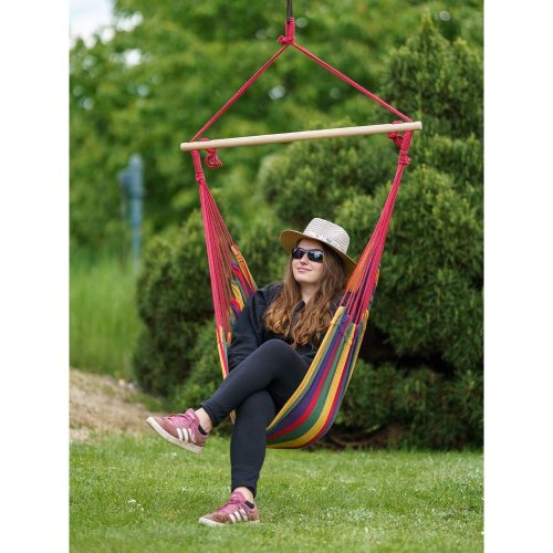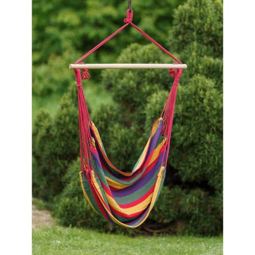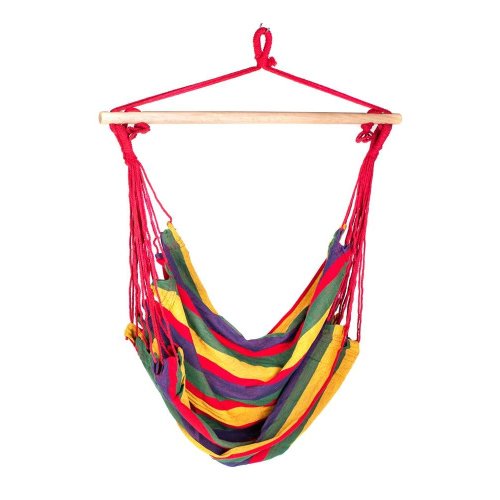 Závesné hojdacie kreslo je vhodné na terasy, do záhrad, ale aj interiéru. Kreslo má pevnú konštrukciu, jednobodové zavesenie a pestrofarebné prevedenie. Rozmery kresla: 100 x 100 cm, maximálna nosnosť 85 kg.