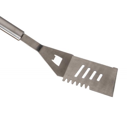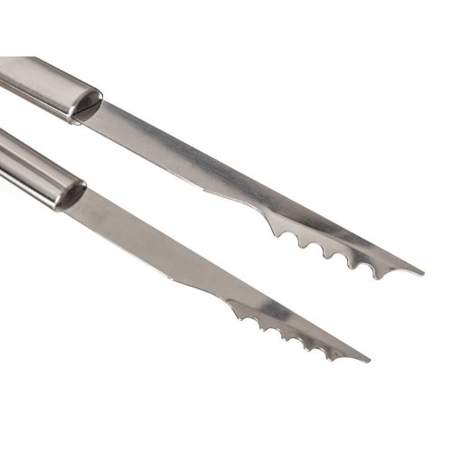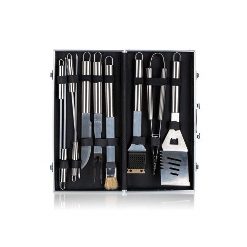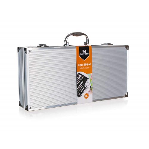 10dielna sada grilovacieho príslušenstva balená v luxusnom hliníkovom kufríku obsahuje: čistiacu drôtenú kefu, grilovacie zubaté kliešte, multifunkčnú obracačku, porciovací nôž, vidlička s 2 hrotmi, 4 grilovacie ihlice a štetec. Súprava je balená v masívnom hliníkovom kufríku a obsahuje základné náradie potrebné pri grilovaní, ktoré je vybavené očkami pre možnosť zavesenia. Veľkosť jednotlivých dielov: obracačka 43 cm, kliešte 40,5 cm, kefa 40,5 cm, štetec 44 cm, vidlica 42 cm, nôž 39 cm a ihlice na špíz 42 cm.