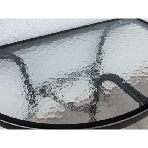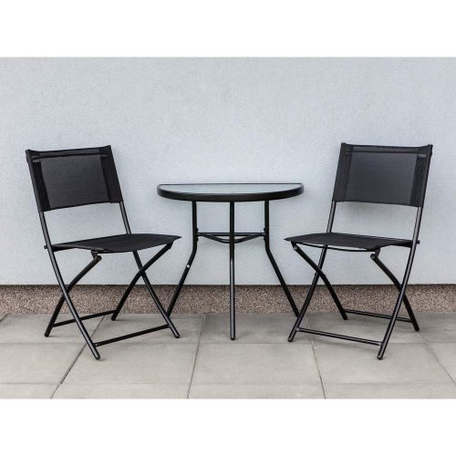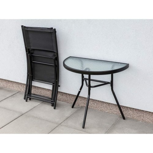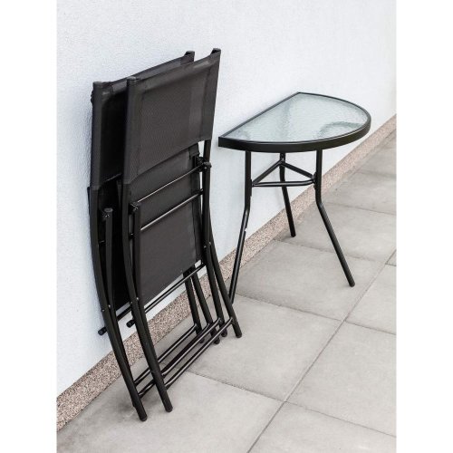 3dielny kovový balkónový set obsahuje: 1 x polkruhový stôl s presklenou vrchnou doskou o rozmere 70 x 40 x 63 cm a 2 x skladacia stolička s textilenovým výpletom 2x1 o rozmere 55 x 45,5 x 78 cm. Jedná sa o priestorovo úsporný set, stôl určený na prisadenie k stene, alebo balkónovému zábradliu a stoličky zaberajú po zložení minimum priestoru.