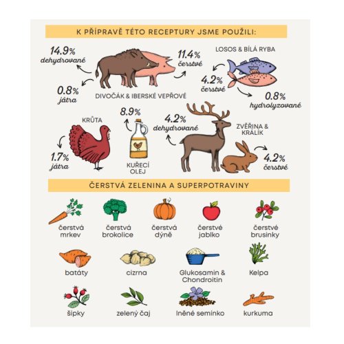 Zloženie: dehydrované iberské bravčové 14,9%, dehydrované zemiaky, kurací olej (chránené prírodnými tokoferolmi) 8,9%, celý zelený hrášok, čerstvé vykostené bravčové 7,2%, zemiakový škrob, dehydrovaná zver 4,2%, čerstvý los ,2 %, čerstvý vykostený králik 4,2 %, čerstvý vykostený diviak 4,2 %, celý cícer 4,2 %, celý žltý hrášok 4 %, jablčná vláknina, dehydrované sladké zemiaky 2,1 %, minerálne látky, hydrolyzát z morky 1,7 %, hydrolyzát z bravčovej pečene 0,8 %, hydrolyzát z rýb 0,8 %, ľanové semienko (prírodný zdroj mastných kyselín ω3) 0,6 %, repné rezne, kvasnice (Saccharomyces cerevisiae), čerstvá brokolica 100 mg kg, čerstvá tekvica 1000 mg/kg, čerstvé jablká 1000 mg/kg, čerstvá mrkva 1000 mg/kg, glukosamín 1000 mg/kg, chondroitín 600 mg/kg, hydrolyzovaná bunková stena kvasníc (zdroj MOS) 50 zdroj FOS) 500 mg/kg, výťažok z mandarínky 400 mg/kg, Yucca schidigera 200 mg/kg, riasa Kelpa 30 mg/kg, klikva celé plody 30 mg/kg, šípky (bohaté na vitamín C) 30 mg/kg, zelený čaj 30 mg/kg, kurkuma 30 mg/kg.