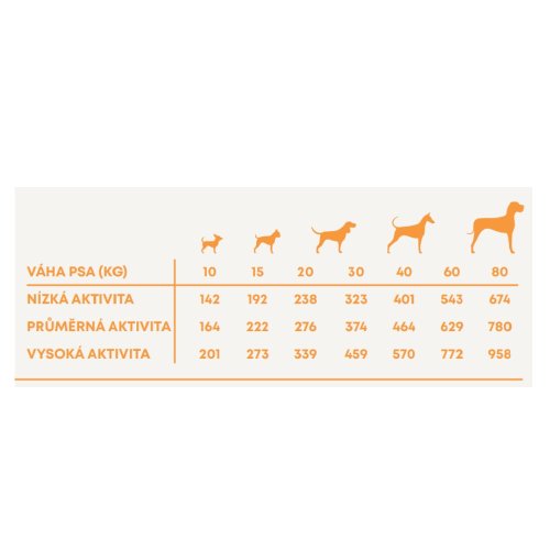 Kŕmny návod: zmenu krmiva je potrebné vykonávať postupne po dobu 7 dní. Ako návod použite tabuľku s dávkovaním. Denné množstvo potravy sa môže pre každého psa líšiť, záleží na úrovni jeho aktivity, plemene a podmienkach prostredia. Dennú kŕmnu dávku podávajte prednostne rozdelenú na 2 až 3 porcie denne, a to vždy v rovnakom čase. Pes musí mať vždy prístup k čistej, čerstvej vode. Skladovanie: skladujte na chladnom a suchom mieste. Obal by mal byť po použití vždy bezpečne uzavretý.
