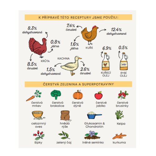 Zloženie: dehydrované kuracie 12,4%, čerstvá vykostená morka 8,5%, extrudovaná ryža, celý zelený hrášok, dehydrovaná morka, celozrnný ovos 8,3%, celozrnná ryža 8%, kurací olej (chránené prírodnými toko , celý žltý hrášok, čerstvé vykostené kuracie 4,1 %, celozrnný jačmeň 4,1 %, čerstvá kuracia pečeň 3,3 %, čerstvá vykostená kačica 2,6 %, hydrolyzát z kuracej pečene 1,6 %, dehydrovaná kačica 1, %, repné rezne, jablčná vláknina, hydrolyzát z morčacej pečene 0,8 %, minerálne látky, ľanové semienko (prírodný zdroj mastných kyselín ω3) 0,5 %, rybí olej (chránené prírodnými tokoferolmi) 0,5 %, kvasnice (Saccharomyces cere ), čerstvá brokolica 1000 mg/kg, čerstvá tekvica 1000 mg/kg, čerstvé jablká 1000 mg/kg, čerstvá mrkva 1000 mg/kg, glukosamín 1000 mg/kg, chondroitín 600 mg/kg, hydrolyzovaná bunková 500 mg/kg, čakanka (zdroj FOS) 500 mg/kg, výťažok z mandarínky 400 mg/kg, Yucca schidigera 200 mg/kg, Riasa Kelpa 30 mg/kg, klikva celé plody 30 mg/kg, šípky (bohaté na vitamín C) 30 mg/kg, zelený čaj 30 mg/kg, kurkuma 30 mg/kg.