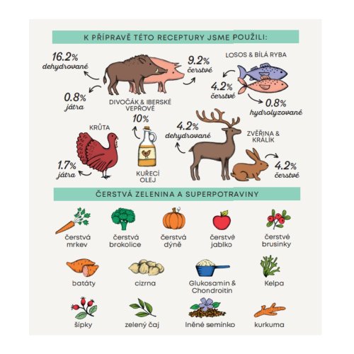 Zloženie: dehydrované iberské bravčové 16,2%, dehydrované zemiaky, kurací olej (chránené prírodnými tokoferolmi) 10%, celý zelený hrášok, jablčná vláknina, čerstvé vykostené bravčové 5%, celý žltý hrášok 4,3%, dehydrovaná zver . , čerstvý losos 4,2 %, čerstvý vykostený králik 4,2 %, čerstvý vykostený diviak 4,2 %, celé cícer 4,2 %, repné rezne, dehydrované sladké zemiaky 2,1 %, minerálne látky, hydrolyzát z morčacej pečene ,7 %, hydrolyzát z bravčovej pečene 0,8 %, hydrolyzát z rýb 0,8 %, ľanové semienko (prírodný zdroj mastných kyselín ω3) 0,6 %, kvasnice (Saccharomyces cerevisiae), čerstvá brokolica 1000 mg/kg, čerstvá tekvica 1000 mg/kg, čerstvé jablká 1000 mg/kg, čerstvá mrkva 1000 mg/kg, glukosamín 1000 mg/kg, chondroitín 600 mg/kg, hydrolyzovaná bunková stena kvasníc (zdroj MOS) 500 mg/kg, čak0 mg/kg, Yucca schidigera 200 mg/kg, riasa Kelpa 30 mg/kg, klikva celé plody 30 mg/kg, šípky (bohaté na vitamín C) 30 mg/kg, zelený čaj 30 mg/kg, kurkuma 30 mg/kg .