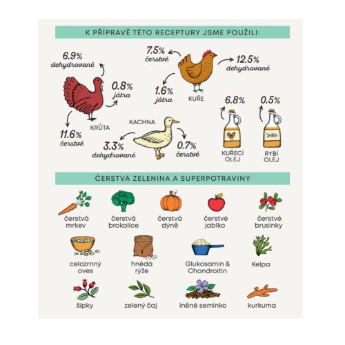 Zloženie: dehydrované kuracie mäso 12,5 %, extrudovaná ryža, čerstvá vykostená morka 8,3 %, celozrnný ovos, celý zelený hrášok, dehydrovaná morka 6,9 %, kurací olej (chránené prírodnými tokoferolmi) 6,8 %, celozrnný celý žltý hrášok, čerstvé vykostené kuracie mäso 4,2 %, celozrnný jačmeň, dehydrovaná kačica 3,3 %, čerstvá kuracia pečeň 3,3 %, čerstvá morčacia pečeň 3,3 %, repné rezne, hydrolyzát z kuracej pečene 1, , hydrolyzát z morčacej pečene 0,8 %, čerstvá vykostená kačica 0,7 %, ľanové semienko (prírodný zdroj mastných kyselín ω3), jablková vláknina, rybí olej (chránené prírodnými tokoferolmi) 0,5 %, minerálne látky, kvasnice (Saccharom ), čerstvá brokolica 1000 mg/kg, čerstvá tekvica 1000 mg/kg, čerstvé jablká 1000 mg/kg, čerstvá mrkva 1000 mg/kg, glukosamín 1000 mg/kg, chondroitín 600 mg/kg, hydrolyzovaná bunková 500 mg/kg, čakanka (zdroj FOS) 500 mg/kg, výťažok z mandarínky 500 mg/kg, Yucca schidigera 200 mg/kg, Riasa Kelpa 30 mg/kg, klikva celé plody 30 mg/kg, šípky (bohaté na vitamín C) 30 mg/kg, zelený čaj 30 mg/kg, kurkuma 30 mg/kg.