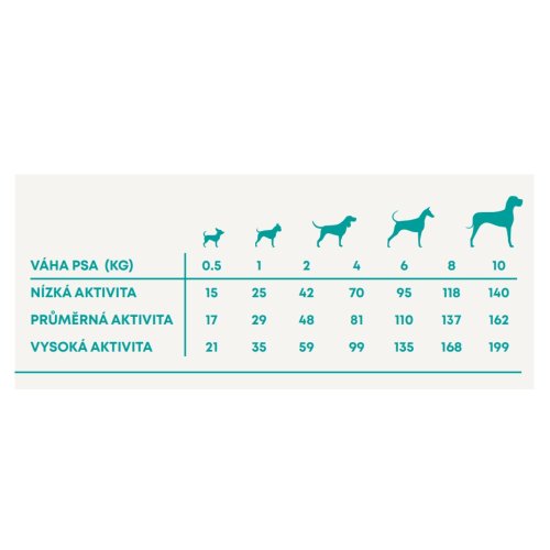 Kŕmny návod: zmenu krmiva je potrebné vykonávať postupne po dobu 7 dní. Ako návod použite tabuľku s dávkovaním. Denné množstvo potravy sa môže pre každého psa líšiť, záleží na úrovni jeho aktivity, plemene a podmienkach prostredia. Dennú kŕmnu dávku podávajte prednostne rozdelenú na 2 až 3 porcie denne, a to vždy v rovnakom čase. Pes musí mať vždy prístup k čistej, čerstvej vode. Skladovanie: skladujte na chladnom a suchom mieste. Obal by mal byť po použití vždy bezpečne uzavretý.