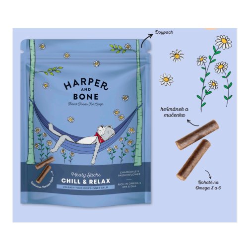 Harper and Bone Meaty sticks Chill & relax navyše obsahuje EPA a DHA, čo sú dôležité omega-3 mastné kyseliny pre zdravie mozgu a srdcového systému.