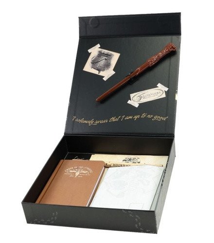 Darčeková sada v pevnom boxe. Balenie obsahuje A5 zápisník, písacie pero/prútik, 2× ceruzku, pravítko, strúhadlo, gumu, 6 obálok, 12 listových papierov, 5× hárok samolepiek a 10× pečatné samolepky na list. Ideálne darčeke pre fanúšikov kúzelníckeho sveta Harry Potter.