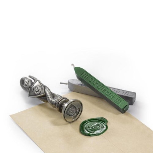 Slizolinský pečatiaci set. Súčasťou balenia je kovová pečatička s erbom Zmijozelu a 2 farebné vosky.