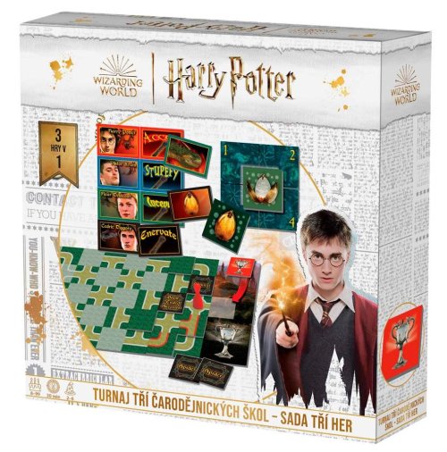 Sada troch hier, každá hra predstavuje jednu úlohu z Turnaja o Ohnivý pohár. Všetky hry vás priamo vtiahnu do napínavého deja. Princípy všetkých hier sú jednoduché a priebeh je veľmi variabilný. Na svoje si prídu čarodejníci všetkých vekových kategórií, ktorým môžu byť rovnocennými súpermi aj muklovia. •úloha – Súboj s drakmi: Cieľom hry je zostaviť rad kartičiek, v ktorej každý hráč musí vybojovať tri súboje s drakmi, premôcť ich v záverečnom súboji a získať Zlaté vajcia. Špecifikácia: vek 8-99, 2-4 hráči, 25-35 minút, obsahuje 64 hracích kartičiek s účastníkmi turnaja, drakmi, kúzlami a Zlatým vajcom, návod česky a slovensky •2. úloha – Rozlúštenie tajomstva Zlatého vajca: Cieľom hry je zostaviť kartičky do kvintetov takým spôsobom, aby hráči objavili v prvej časti hry tajomstvo Zlatého vajca av druhej časti hry oslobodili svojho zajatca z hlbín Čierneho jazera. Špecifikácia: vek 8-99, 2-4 hráči, 35-50 minút, obsahuje 120 hracích kartičiek s účastníkmi turnaja, vodnou plochou, podvodnými živočíchmi a Zlatým vajcom, návod česky a slovensky •3.úloha - Cesta bludiskom: Cieľom hry je prejsť čo najskôr bludisko a získať Pohár troch čarodejníckych škôl – OHNIVÝ POHÁR. Každý hráč postupuje na svojom hracom pláne bludiska pomocou kartičiek s rôznymi cestami, kedy musia prekonávať prekážky, ktoré im nadeľujú súperovi. Špecifikácia: • vek 8-99, • 2-4 hráči, • 30 - 45 minút, • obsahuje 4 hracie plány, • 4 figúrky, • 120 hracích kartičiek s rôznymi cestami a prekážkami, • 4 kartičky s Ohnivým pohárikom, • návod česky a slovensky