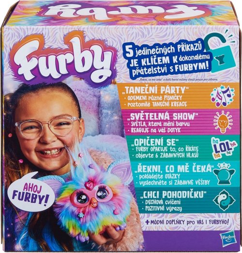 Interaktívna hračka, ktorá hovorí po česky aj „furbijsky“. Reaguje na 5 hlasových pokynov (s 3 ďalšími unikátnymi režimami). Furby hrá hudbu v režime Tanec. Pohyblivé nohy, oči a uši so svetelnými efektmi. Súčasťou balenia sú doplnky na štýlovanie a hranie. Na prevádzku sú potrebné 4ks batérie typu AA (nie sú súčasťou balenia).