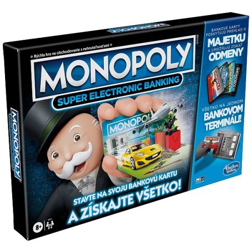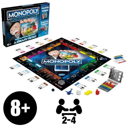 Obľúbenú spoločenskú hru Monopoly od značky Hasbro si môžete užiť aj vo vylepšenej bezhotovostnej verzii a to úplne v slovenskom jazyku. Ku každej figúrke sa viaže aj banková karta, pomocou ktorej prebiehajú na bankovom termináli všetky transakcie. Hra má inak veľmi podobné pravidlá ako klasické Monopoly s niekoľkými inováciami. Každá karta umožňuje hráčom zarábať na každom ťahu odmeny, ako je rýchly pohyb okolo herného plánu, alebo získavať bonusy pri každom nákupe. Čerpajte z balíčka odmien pre ešte viac bonusov! Ale pozor na podvody, ktoré umožňujú ostatným hráčom kradnúť odmeny a vlastnosti. Bankové technológie „tap and spin“ v štýle all-in-one robia hru rýchlu a zábavnú vďaka bezhotovostnému hraniu. Hráči si môžu okamžite kúpiť nehnuteľnosti, platiť nájomné a stúpať na ceste k bohatstvu. Táto dosková hra vám zaistí chvíle napätia a zábavy. Balenie obsahuje: hraciu dosku, bankový terminál, 4 figúrky a bankové karty, 16 kariet kúpna zmluva, 20 kariet šance, 4 referenčné karty, 1 kocku a návod. Do bankového terminálu je potrebné zaobstarať 3 batérie typu AAA. Pre 2-4 hráčov starších ako 8 rokov. Rozmer balenia: 26,67 x 40 x 4,1 cm