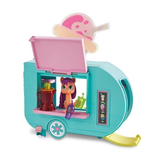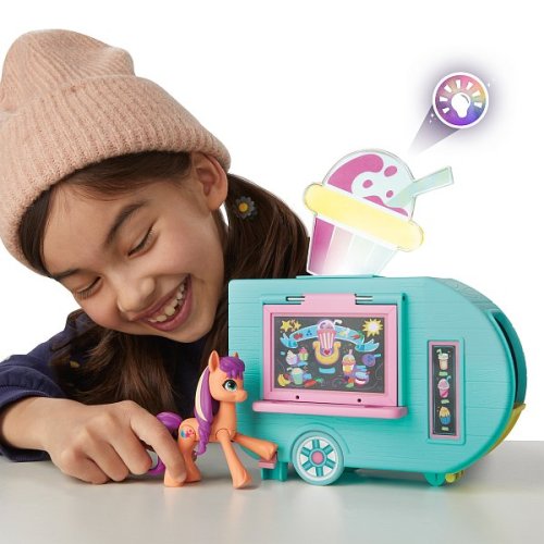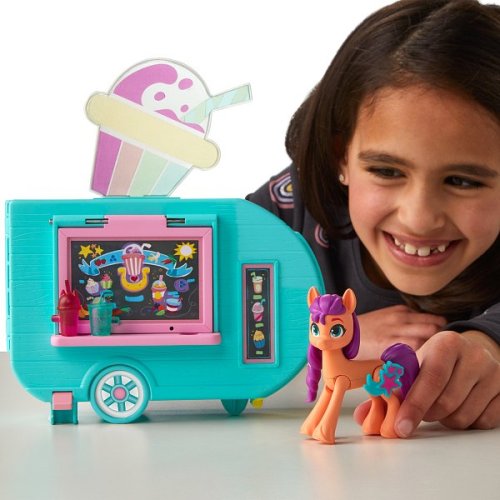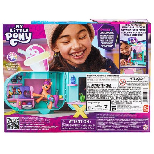 Naservírujte nejaké kúzlo so sadou Sunny Starscout Smoothie Truck 2 v 1 My Little Pony. Sunny je dobrodružný pozemský poník, ktorý vyrába sladké dobroty vo svojom mobilnom smoothie trucku v My Little Pony: Make Your Mark. Súprava My Little Pony obsahuje 3-palcovú kĺbovú figúrku poníka, ktorú môžu deti stavať do rôznych póz. Táto hracia sada nákladiaku s potravinami pre deti sa otvára do kuchynky s predstieraným jedlom. Predstavte si, že pripravujete predstierané košíčky v rúre alebo smoothie v mixéri. Pritlačte kopyto tejto hračky Sunny Starscout na páku nákladiaku, aby ste rozsvietili neónové svetlo a otvorili okno nákladiaku. Potom otvorte nákladiak a odkryte kuchynku vo vnútri. Obsahuje 15 doplnkov, z ktorých niektoré sa pripevňujú na Sunnyho kopyto. Hra s figúrkami podporuje detskú fantáziu a kreativitu. Nákladiak s potravinami My Little Pony, detské herné sady a malé bábiky sú skvelými narodeninovými darčekmi pre dievčatá a chlapcov od 5 rokov. Batéria 3xLR44 (súčasťou balenia). Rozmer balenia: 30,5x23x8 cm.