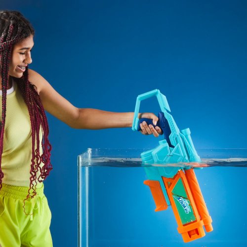 Vodný blaster Nerf Super Soaker Mega Dunk-Fill je vybavený nádržkou ktorá umožňuje rýchle a jednoduché plnenie, takže môžete byť behom okamihu pripravení na vodné dobrodružstvo. Vďaka inovatívnej konštrukcii nádržky sa voda napustí prakticky okamžite – stačí jednoducho ponoriť blaster do vody a sledovať, ako sa ihneď napustí. Transparentná nádrž má kapacitu až 1 liter, čo zaisťuje dlhotrvajúcu zábavu. Pomocou pumpovacej rukoväte potom ľahko aktivujete silný prúd vody. Vodné blastery Nerf Super Soaker sú ideálne vonkajšie hračky pre deti, ktoré skvele oživia každú letnú aktivitu. Sú perfektným darčekom, ktorý motivuje k pohybu a zábave na čerstvom vzduchu, a to s poriadnym šplechaním! Vyrobené z kvalitného plastu. Balené v krabičke. Rozmer balenia: 25,4 x 61 x 6,7 cm. Vek: 6+