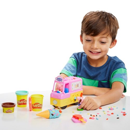Prasiatko Peppa si jednoducho zmrzlinu neodpustí! Kroky letnej zábavy nepochybne povedú smerom Play-Doh pochúťok na osvieženie. So zmrzlinárskym vozidlom si užijete veľa zábavy. Nájdete v ňom vymeniteľné formičky na výrobu Play-Doh nanukov, kornútov a ďalších pamlskov. Kto by sa netešil na figúrku Peppy, ktorá má zospodu pečiatku a môže jazdiť v aute! Vzhľad radu Play-Doh a Peppy sa spája a prináša fascinujúcu zábavu. Prasiatko Peppa s 5 kelímkami, zmrzlinovým vozidlom a množstvom príslušenstva. je tiež perfektný ako darček. Modelína je ľahko tvarovateľná a veľmi mäkká. Nefarbí, nešpiní a nevysychá. Vek: 3+