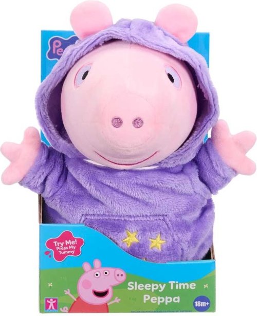 Peppa je pripravená ísť spať vo svojom pyžamku. Mimoriadne hebká a maznavá – ideálna na tulenie do postieľky. Stlačte bruško a budete počuť, ako hovorí.