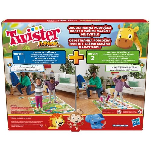 Pripravte sa na poriadnu zábavu s hrou Twister Junior - zvieracím dobrodružstvom, ktoré rastie s vašimi malými neposedmi. Táto zábavná hra pre deti od 3 rokov obsahuje 2strannú podložku a otočný herný bicykel pre 2 úrovne hry. , Aby sa pohybovali po safari chodníku. Ako sa striedajú, každé dieťa má príležitosť objaviť farby a znovu si zopakovať zvuky a pohyby zvierat. Prevráťte podložku a presuňte sa na úroveň 2 hry Animal Party. ! Okrem dokonalého pretiahnutia tela tiež podporí zdravú súťaživosť, podnieti dobré vzťahy v partii kamarátov a rozvinie kreativitu. Táto hra Twister Junior pre 2 až 4 hráčov je zábavou pre celú rodinu a presne sa hodí pre aktívne hranie vo vnútri.