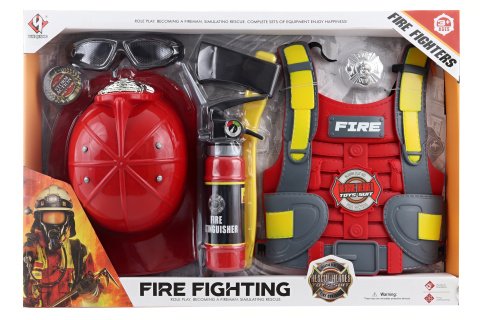 Hasičská sada obsahuje helmu, okuliare, hasičský prístroj, sekeru, odznak a vestu. Rozmery vesty 26x32 cm (vzadu na gumičky). Materiál plast. Balené v otvorenej krabici. Rozmery balenia 59x40x5,5 cm. Vek 3+