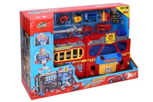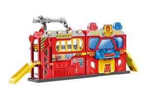 Hasičská stanica prenosná. Rozmery 56x18x23 cm. Svetelné a zvukové efekty. Aktivácia tlačidlom na modrom paneli. 3xAG13 batérie súčasťou. Súčasťou 2 autá s voľnými kolesami, mnoho príslušenstva (dopravné značky, hasičský prístroj, umývačka, čerpacie stanice, diagnostika a ďalšie).