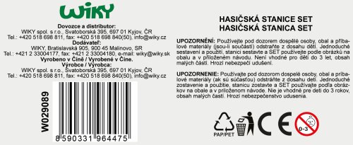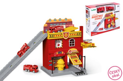 Hasičská stanica. Rozmery 37x17,5x21 cm. Súčasťou dve autá. Voľné kolesá. Manuálny výťah, otváracie dvere. Nálepky a obrázkový návod na zloženie súčasťou balenia.