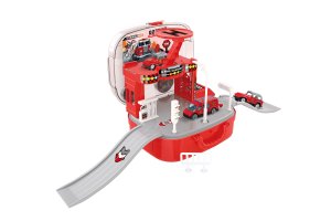 Hasičská stanica v kufríku. Rozmery 44x17x19 cm, veľkosť auta 7 cm. Súčasťou 2 autá, 1 vrtuľník. Manuálny výťah.