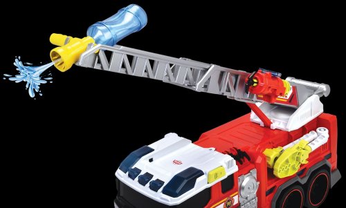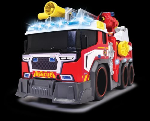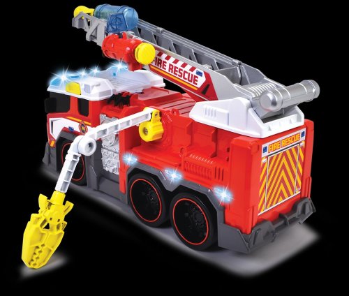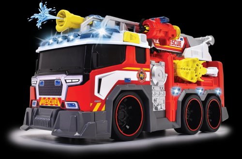 Hasičské auto na voľnobeh, svetelná a zvuková funkcia, funkčná striekačka na vodu, výsuvný rebrík, mechanická ruka, vystreľovacia kotva. Dĺžka 37 cm.