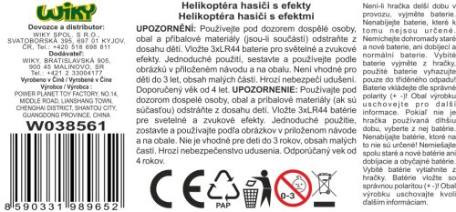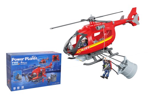 Helikoptéra hasiči s efektmi. Veľkosť 38cm. Helikoptéra má otváracie dvere a kabínu, zmestia sa dovnútra dva panáčikovia. Svetelné a zvukové efekty. Návod vo vnútri. Batéria 3xLR44 súčasťou
