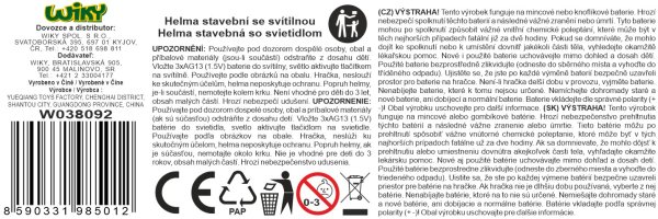 Stavebná helma so svietidlom je ideálnym doplnkom pre bezpečnú hru na stavenisku. Funkcia svietidla zlepšuje viditeľnosť pri práci. Svietidlo má polohovací sklon, jej svetlo sa aktivuje stlačením tlačidla. Batérie do svietidla 3xAG13 sú súčasťou. Súčasťou je elastický popruh na suchý zips. Rozmery helmy: 24 x 19 x 13 cm. Rozmery balenia: 29,5 x 19,9 x 6,5 cm. Vek: 3+