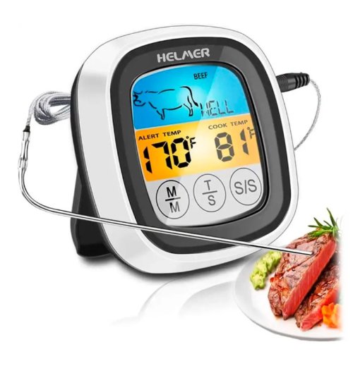 Kuchynský vpichový teplomer umožní presné meranie teploty mäsa či zeleniny v rozmedzí -20 °C až 300 °C . Stačí zapichnúť sondu do pokrmu, umiestniť jednotku s displejom mimo rúry, panvicu alebo gril a na diaľku kontrolovať priebeh pečenia. K dispozícii je tiež funkcia časovača , ktorá vás upozorní alarmom na dosiahnutie prednastavenej teploty alebo času. Pre uľahčenie je vybavený 8 prednastavenými teplotami podľa vybraného druhu mäsa: hovädzie, jahňacie, teľacie, hamburger, bravčové, morčacie, kuracie a ryby. Samozrejmosťou je možnosť nastavenia miery prepečenia v 5 stupňoch . Teplomer je vybavený výklopným stojanom a magnetmi pre ľahké uchytenie na kovový povrch.