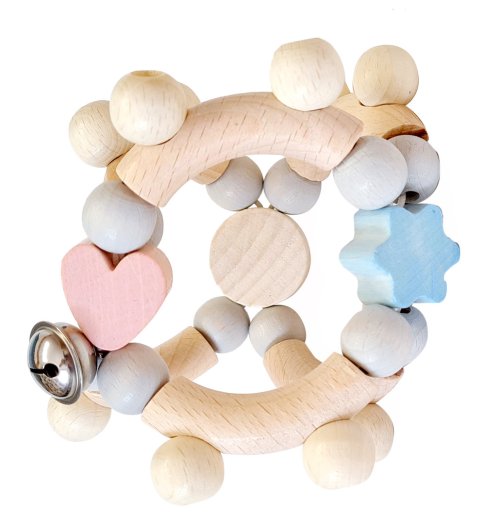 Vysoko kvalitná drevená hračka stimuluje predstavivosť a zaujme pastelovými farbami a rolničkou. Hravou formou trénuje jemnú motoriku dieťaťa. Ak si ju chcete užiť po dlhú dobu, vyvarujte sa nadmerného pôsobenia vody, čistite hračku iba vlhkou handričkou. Hrkálku nevarte, nedávajte do sterilizátora ani nepoužívajte iné sterilizačné metódy. Hlavné vlastnosti: vyrobené eticky z dreva z ekologicky obhospodarovaných lesov použité ekologické a odolné farby