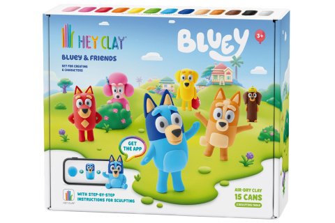 Súprava HEY CLAY inšpirovaná postavičkami z populárnej série Bluey! Veľká sada 15 kelímkov + 2 modelovacie nástroje. Zo sady zostaviť 6 postáv. Vek 3+