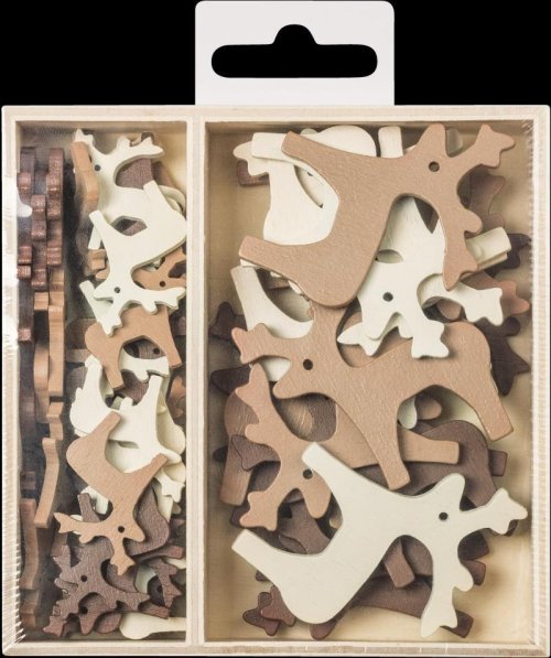 Drevené ozdoby v praktickom boxe, 9 motívov po 5 ks od každého motívu, celkom teda 45 kusov dekorácií. Farba boxu je prírodné drevo. Rozmer jedného motívu cca 3cm x 3cm. Ideálne na zdobenie prianí, darčekov, krabičiek a pod.