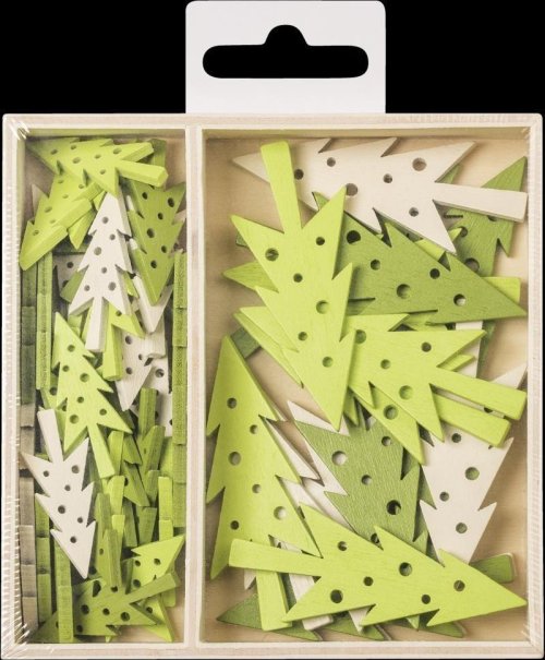 Drevené ozdoby v praktickom boxe, 9 motívov po 5 ks od každého motívu, celkom teda 45 kusov dekorácií. Farba boxu je prírodné drevo. Rozmer jedného motívu cca 3cm x 3cm. Ideálne na zdobenie prianí, darčekov, krabičiek a pod.