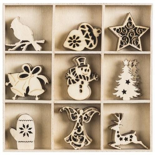 Drevené ozdoby v praktickom boxe, 9 motívov po 5 ks od každého motívu, celkom teda 45 kusov dekorácií. Rozmer jedného motívu cca 3cm x 3cm. Ideálne na zdobenie prianí, darčekov, krabičiek a pod.