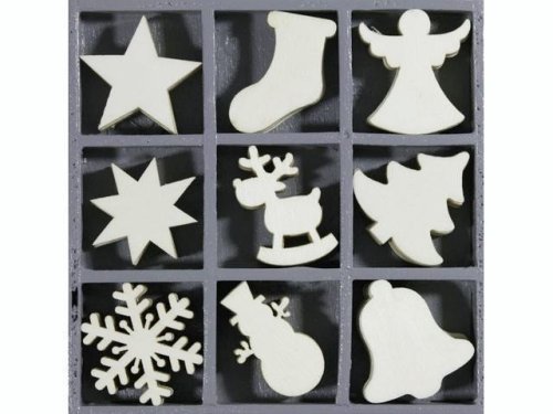 45 ks Drevené ozdoby v boxe - vianoce - 9 motívov po 5 ks, rozmer 10,5 x 10,5 cm