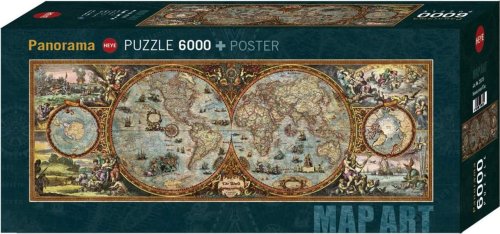 Panoramatické "šesťtisícové" puzzle s kresbou zemských pologuľou od ilustrátora a grafika Rajka Zigice balené v krásnej panoramatickej krabici.