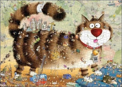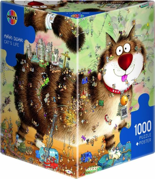 Puzzle od karikaturistu Marina Degana balené v netradičnej trojbokej krabici, ktorá obsahuje plagát ako predlohu na skladanie.